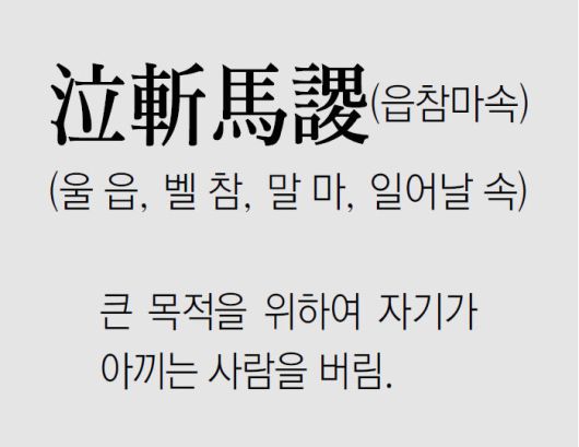 ● 유래: 삼국지(三國志)의 촉서(蜀書)에서 유래한 성어입니다. 마속(馬謖)은 재주와 기량이 뛰어났고, 군사 계획을 논의하는 것을 좋아하여 제갈량이 소중하게 여겼습니다. 유비가 죽기 전 제갈량에게 “마속은 말이 앞서니 큰일을 맡겨서는 안 되오. 반드시 잘 살피시오”라고 말하였으나 제갈량은 마속을 참군(參軍)으로 삼고 남중(南中)을 정벌할 때 마속의 계책을 받아들여 맹획(孟獲)을 용서함으로써 남방을 복종시켰습니다. 건흥(建興) 6년(228년) 제갈량이 기산(祁山)을 향해 군대를 출동시킬 때 사람들이 장수 위연(魏延)과 오일(吳壹)을 선봉으로 삼아야 한다고 했습니다. 제갈량은 이들 말을 듣지 않고 마속을 뽑아 대군을 거느리게 했습니다. 마속은 위나라 장수 장합(張郃)과 가정(街亭)에서 싸워 장합에게 크게 패했고 병사들은 뿔뿔이 흩어졌습니다. 제갈량은 중요한 거점을 잃어 군대를 퇴각시킬 수밖에 없었습니다. 제갈량은 군령을 어긴 마속을 하옥했다가 눈물을 흘리며 처형하였습니다. 그때 마속의 나이는 39세였습니다.
