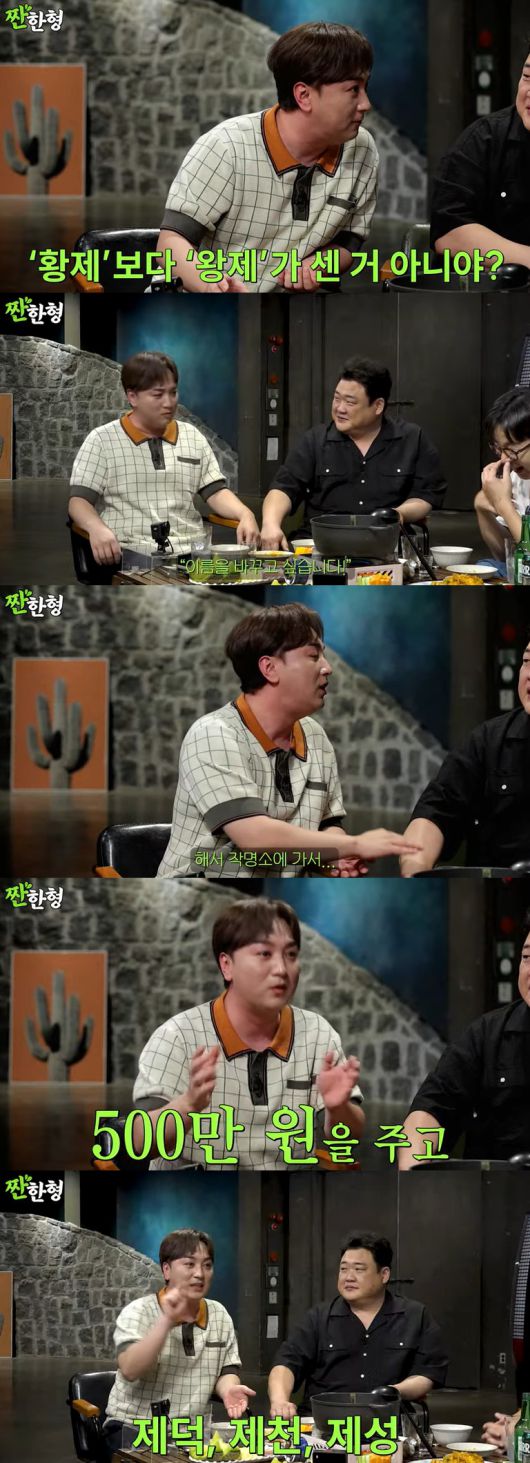 그렇게 개명을 다짐한 황제성은 바로 부모님한테 가서 이름을 바꾸고 싶다고 했다고. 황제성은 "작명소에 갔다. 500만 원을 주고 제덕, 제천, 제성이 있는데 이상하게 거기 눈이 가서 제성으로 했다"고 밝혔다.