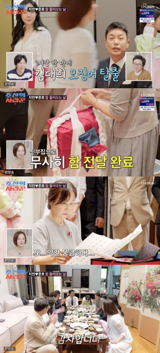 드디어 함이 안전하게 도착했다. 혼서지를 본 김지민의 어머니는 “너무 감동이다. 지민이를 예뻐하는 만큼 준비하셨다고 생각하고 싶다”라며 울컥하는 모습을 보였다. 김지민은 도움을 준 모든 이들에게 고맙다며 “싸우지 않고 백년해로하겠다”라고 말했다.
