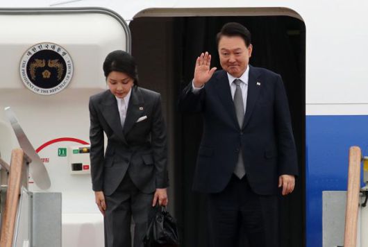 윤석열 대통령과 김건희 여사가 지난해 10월 6일 경기 성남시 서울공항에서 아세안정상회의 참석차 출국하기 전 공군1호기에 올라 인사를 하고 있다. 왕태석 선임기자 |