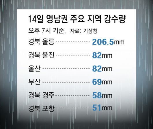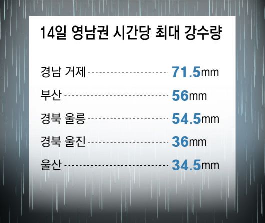 기상청에 따르면 14일 오후 4시 기준 경북 울릉 하루 강수량은 206.5mm였다. 울산과 경북 울진은 82mm, 부산에서는 69mm의 비가 내렸다. 경남 거제는 이날 밤 12시경 시간당 71.5mm의 폭우가 쏟아졌다. 부산에도 한때 시간당 56mm의 많은 비가 한꺼번에 내렸다. 이날 오후 충남과 전북 일부에도 많은 비가 올 것으로 예상돼 호우특보가 내려졌다.