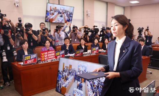 與野, 인사청문회 첫날부터 격한 대치 강선우 여성가족부 장관 후보자(오른쪽)가 14일 국회 인사청문회에서 선서문을 전달하기 위해 여성가족위원장석으로 향하고 있다. 이날 청문회에서 국민의힘은 ‘보좌관 갑질 의혹’을 부각하기 위해 ‘갑질왕 강선우 아웃(OUT)’ 등의 피켓을 노트북에 내걸었다. 그러자 더불어민주당이 이를 떼라고 강하게 요구하는 등 여야는 청문회 초반 고성 속에 대치하기도 했다. 장승윤 기자 tomato99@donga.com |