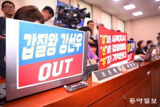 “갑질왕” 피켓에 “내란정당” 맞불 14일 국회 여성가족위원회에서 열린 강선우 여성가족부 장관 후보자 인사청문회에서 국민의힘 의원들이 강 후보자를 규탄하는 ‘갑질왕 강선우 아웃(OUT)’ 팻말을 노트북에 붙여놓고 있다. 더불어민주당 의원들은 ‘내란정당 아웃 발목잡기 스탑’ 팻말로 맞불을 놨다. 이훈구 기자 ufo@donga.com |