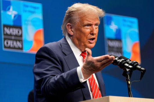도널드 트럼프 미국 대통령이 지난달 25일 네덜란드 헤이그에서 열린 북대서양조약기구 정상회의에 참석한 뒤 기자회견하고 있다. 헤이그=AP 뉴시스 |