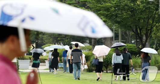 연일 무더운 날씨가 지속되고 있는 9일 전북 전주시 전북특별자치도청 앞에서 시민들이 양산을 펼쳐 들고 따가운 햇빛을 막으며 이동하고 있다. 2025.7.9/뉴스1 ⓒ News1 유경석 기자 |