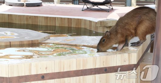 폭염이 이어지는 9일 오전 제주 서귀포시 안덕면 제주신화월드 내 개장을 앞둔 카피바라 특화 동물원인 '모모쥬 동물원'에서 카피바라가 물놀이를 하고 있다. 2025.7.9/뉴스1 ⓒ News1 오현지 기자 |