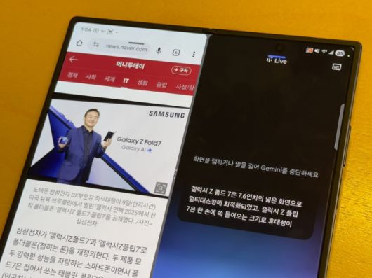 이 같은 기능은 폴드7을 활용했을 때 편의성이 더욱 커진다. 주 화면을 바형 스마트폰 2개 크기로 분할한 뒤 한쪽에 작업대상, 반대쪽에 챗봇 형태의 AI 서비스를 띄워놓은 채 작업상황을 동시에 확인할 수 있어서다. 기존의 바형 스마트폰에선 사용자가 화면전환에 따른 주의력 저하나 비좁은 화면공간이 주는 불편함을 고스란히 감수했어야 했던 대목이다.