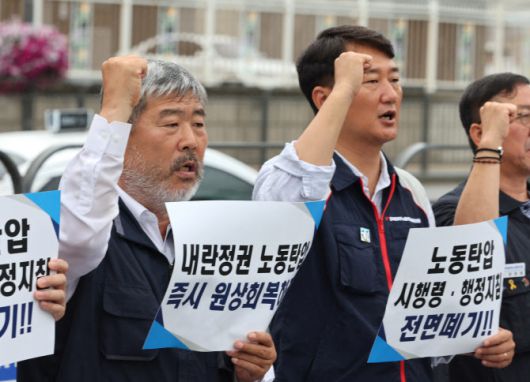지난 6월 25일 서울 용산구 대통령실 앞에서 열린 ‘위법한 시행령·행정지침 원상회복 요구 양대노총 기자회견’에서 양경수(오른쪽) 민주노총 위원장과 김동명 한국노총 위원장이 구호를 외치고 있다.(사진=연합뉴스) |
