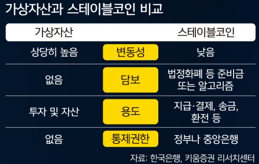 스테이블코인은 가격 변동이 극심한 가상화폐와 달리 원화, 달러 같은 법정화폐 등에 일대일로 가치를 고정시킨 안정적인 암호화폐다. 법정화폐뿐 아니라 가상화폐 담보, 알고리즘 기반도 있다. 2022년 일주일 만에 450억달러의 시가총액이 증발한 테라-루나가 알고리즘 기반 스테이블코인이었다. 이 때문에 스테이블코인을 법제화한 나라들은 알고리즘 기반을 금지하고 발행량에 상응하는 준비금을 일대일로 예치하도록 하고 있다. 고객이 현금으로 인출하고 싶을 때 곧바로 지급할 수 있도록 한 것이다.