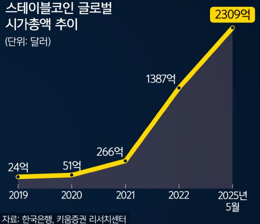 전 세계 스테이블코인 시가총액은 2019년 24억달러에서 지난 5월 말 기준 2300억달러(주요 10종)로 폭증했다. 이 가운데 달러 기반 테더(USTD)와 미국에 상장된 유일한 스테이블코인 회사인 서클이 발행하는 USDC의 시가총액이 각각 1531억달러, 610억달러로 대부분을 차지하고 있다. 또 스테이블코인의 준비자산 81.5%(1728억달러)가 미 국채다. 지니어스 법안이 발효되면 미 국채 수요가 2028년까지 2조달러에 달할 것으로 스탠다드차타드은행은 추산했다.