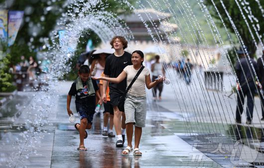 폭염이 이어지고 있는 9일 서울 종로구 광화문광장을 찾은 관광객이 바닥분수에서 더위를 식히고 있다. 2025.7.9/뉴스1 ⓒ News1 김도우 기자 |