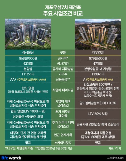 이외에도 △전용면적 3.3㎡당 공사비(삼성물산 868만9000원·대우건설 879만6000원) △공사기간(삼성물산 43개월·대우건설 47개월) △공사비 지급방법(삼성물산 분양불·대우건설 분양수입금 내 기성불) △가구수(삼성물산 1112가구·대우건설 1130가구) 등 다수 사업조건에서 차이를 보이고 있어 이에 대한 조합원들의 판단이 수주전 승패 여부를 좌우할 것으로 보인다.