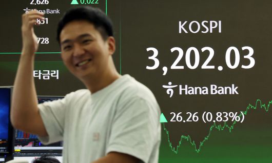 이날 코스피 지수는 전장보다 26.26포인트(0.83%) 오른 3202.03에 장을 마쳤다. 코스피 종가가 3200선을 웃돈 것은 2021년 9월 6일(3203.33) 이후 3년10개월 만이다.