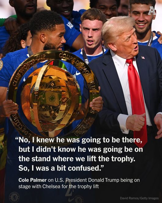 미국 'AP 통신'은 14일(한국시간) "파머는 트럼프와 클럽 월드컵 포디움 스포트라이트를 공유하면서 깜짝 놀랐다. 그는 주장 리스 제임스가 우승 트로피를 받는 동안 뒤에서 점프하고 있었고, 트럼프 미국 대통령은 파머와 골키퍼 로베르트 산체스 사이에 서 있었다"라고 보도했다.