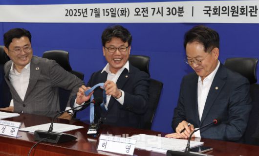 [이데일리 노진환 기자] 더불어민주당 2025년 폭염 대책 당정 간담회가 15일 서울 여의도 국회 의원회관에서 열렸다. 진성준 정책위의장이 넥타이를 풀고 있다.
