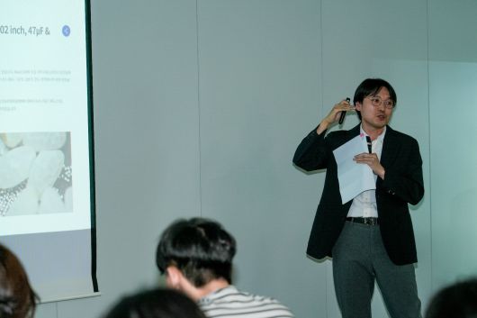 이민곤 삼성전기 MLCC 개발팀 상무가 14일 서울 중구 태평로빌딩에서 열린 삼성전기 제품학습회에서 설명하고 있다./삼성전기 제공 |