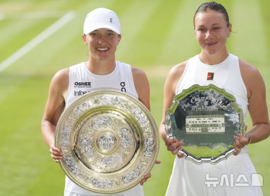 [런던=AP/뉴시스] 이가 시비옹테크(4위·폴란드, 왼쪽)가 12일(현지 시간) 영국 런던 올잉글랜드 클럽에서 열린 2025 윔블던 테니스 대회 여자 단식 정상에 오른 후 준우승을 차지한 어맨다 아니시모바(12위·미국)와 기념 촬영하고 있다. 프랑스오픈 4회, US오픈 1회 우승 경험이 있는 시비옹테크는 잔디 코트인 윔블던에서 처음으로 결승에 올라 2-0(6-0 6-0)으로 승리하고 우승컵을 들어 올렸다. 2025.07.13. |