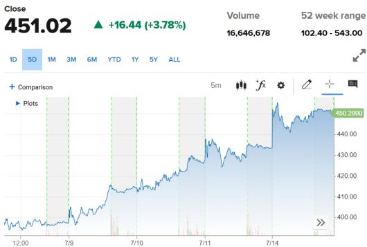 마이크로스트래터지 주가 추이. 14일(현지시간) 종가 451.02달러. 출처 CNBC |