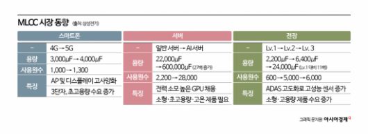 2010년대까지만 해도 삼성전기가 생산하는 MLCC는 대부분 스마트폰 및 TV 제품군에 공급됐다. 최근 들어서는 AI 서버부터 전기차, 첨단 운전자 보조 시스템(ADAS), 자율주행 시스템 등에 들어가는 고성능 MLCC가 미래 먹거리로 부상하는 흐름이다.