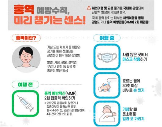 아울러 여행 시에는 사람이 많은 장소에서 마스크를 착용하고, 비누로 30초 이상 손 씻기, 기침 예절 준수 등 개인 위생 수칙도 함께 지켜야 한다고 당부했다.