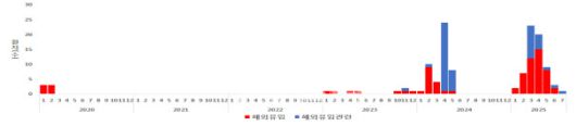 2020~2025년 월별 홍역 환자 발생 및 유입 현황 |