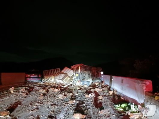15일 0시10분쯤 경북 문경시 중부내륙고속도로 창원방향 불정터널 인근에서 화물차가 전복돼 닭이 쏟아져 한때 극심한 차량 정체를 보였다.(경북소방본부 제공.재판매 및 DB금지) |