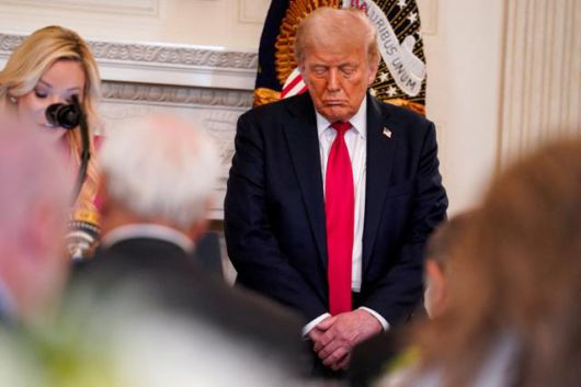 도널드 트럼프 미국 대통령이 14일 워싱턴 백악관에서 열린 신앙사무실 오찬 간담회에서 기도하고 있다. 워싱턴=로이터 연합뉴스 |