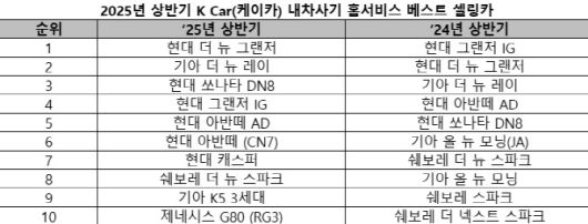 국내 최대 직영중고차 플랫폼 기업 케이카(381970)는 온라인 구매 서비스 ‘내차사기 홈서비스’의 올해 상반기 판매 데이터를 분석한 결과, 상위 10선을 중대형 세단과 경차가 양분한 것으로 나타났다고 15일 밝혔다.
