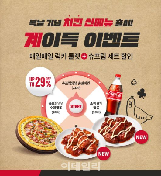 피자헛은 신제품 출시를 기념해 8월 11일까지 매일 참여할 수 있는 ‘복날 기념 계이득 이벤트’도 진행한다. 피자헛 온라인 회원이라면 누구나 하루 1회, 룰렛 이벤트를 통해 소이갈릭 윙봉, 슈프림양념 치킨 등 신제품 무료 쿠폰을 받을 수 있다.
