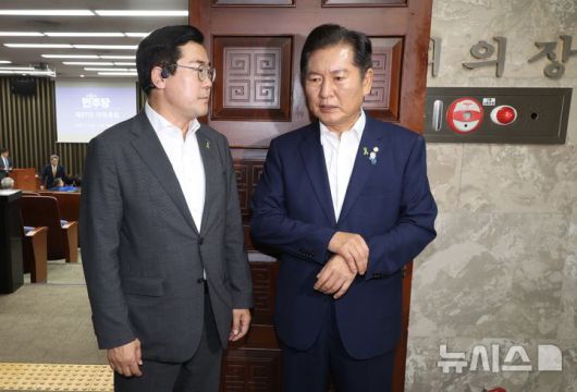 [서울=뉴시스] 조성봉 기자 = 더불어민주당 당대표 출마를 선언한 정청래, 박찬대(왼쪽) 의원이 3일 오후 서울 여의도 국회에서 열린 비공개 의원총회에서 대화를 하고 있다.2025.07.03. suncho21@newsis.com |