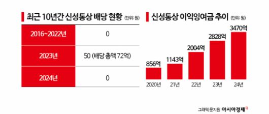 신성통상은 그동안 '짠물배당'으로 비판을 받아왔다. 최근 10년간 한 차례 배당에 그쳤는데, 2022년(2022년 7월~2023년 6월) 기준 결산 배당은 1주당 50원에 그쳤다. 총 배당금 규모는 72억원이었다. 스파(SPA)브랜드 '탑텐'이 경기 불황 속에서 역대급 성장세를 보이며 지난해 1조원에 가까운(9700억원) 매출고를 기록했지만, 무배당 정책을 이어갔다.