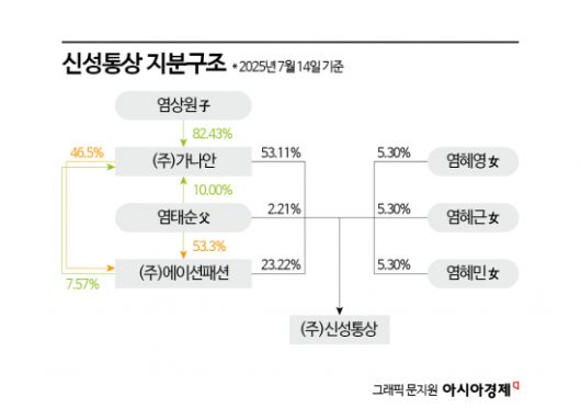 염 회장의 세 딸인 염혜영(5.3%), 염혜근(5.3%), 염혜민(5.3%)씨는 신성통상의 지분을 똑같이 갖고있다. 염 회장이 세 딸에게 마지막으로 지분을 증여한 것은 지난해 2월13일로 각각 지분율 기준 2%(28만여주)씩 줬다.