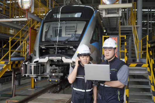 용유차량기지에서 공항철도 직원들이 5G 특화망에 연결된 노트북을 통해 객차 및 설비를 점검하는 모습