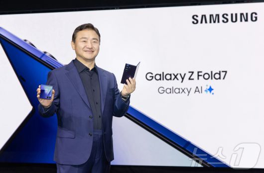 노태문 삼성전자 DX부문장 직무대행 사장이 9일(현지시간) 미국 뉴욕 브루클린 듀갈 그린하우스(Duggal Greenhouse)에서 열린 '갤럭시 언팩 2025(Galaxy Unpacked 2025)' 행사에서 초슬림 대화면 폴더블폰 '갤럭시 Z 폴드7'과 '갤럭시 Z 플립7'을 공개하고 있다. (삼성전자 제공. 재판매 및 DB 금지) 2025.7.9/뉴스1 |