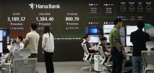 3년 10개월만에 최고치를 찍은 코스피가 하루만에 숨고르기에 들어간 15일 서울 중구 하나은행 딜링룸 모니터에 코스피를 비롯해 원/환율, 코스닥 지수가 표시돼 있다. 이날 코스피 지수는 전 거래일보다 9.18포인트(-0.29%) 내린 3,192.85로 장을 시작해 약보합세를 이어가고 있다. <ⓒ투자가를 위한 경제콘텐츠 플랫폼, 아시아경제(www.asiae.co.kr) 무단전재 배포금지>