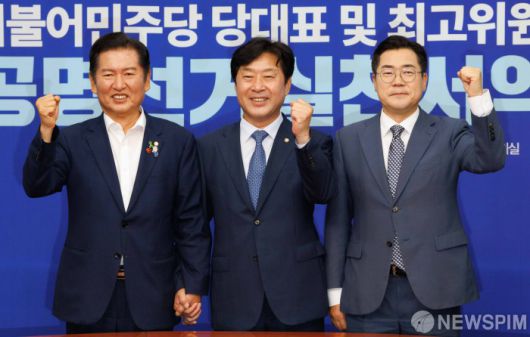 [서울=뉴스핌] 윤창빈 기자 = 정청래 더불어민주당 대표 후보(왼쪽부터), 황명선 최고위원 후보, 박찬대 당대표 후보가 15일 오전 서울 여의도 국회에서 열린 공명선거실천서약식에서 서약서에 서명을 마치고 기념촬영을 하고 있다. 2025.07.15 pangbin@newspim.com