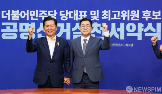 [서울=뉴스핌] 윤창빈 기자 = 정청래·박찬대 더불어민주당 대표 후보가 15일 오전 서울 여의도 국회에서 열린 공명선거실천서약식에서 서약서에 서명을 마치고 기념촬영을 하고 있다. 2025.07.15 pangbin@newspim.com