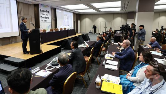 (서울=뉴스1) 김도우 기자 = 노태악 중앙선거관리위원회 위원장이 15일 서울 강남구 코엑스에서 열린 '2025 국제선거포럼'에 참석해 환영사를 하고 있다. 2025.7.15/뉴스1