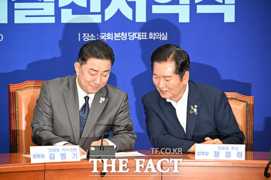 [더팩트ㅣ국회=박헌우 기자] 김병기 더불어민주당 당대표 직무대행 겸 원내대표(왼쪽)와 정청래 더불어민주당 당대표 후보가 15일 오전 서울 여의도 국회에서 열린 '더불어민주당 공명선거실천서약식'에 참석해 대화를 나누고 있다.