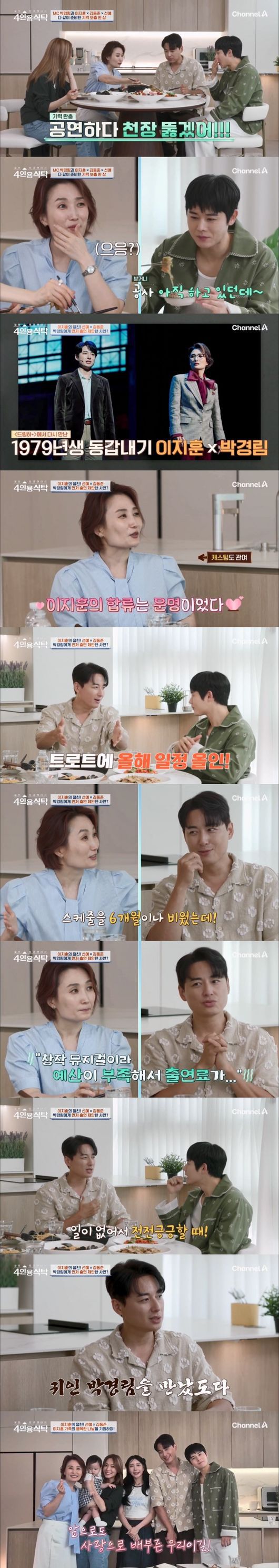 14일 방송된 채널A ‘절친 토큐멘터리 4인용식탁’에서 이지훈은 함께 뮤지컬 무대에 오르고 있는 선예와 김동준을 자신의 식탁에 초대했다. 여기에 MC 박경림도 ‘크리에이티브 디렉터’이자 ‘기린예고 교장’ 역으로 뮤지컬 무대를 함께 하고 있어, 네 사람은 자연스레 뮤지컬 이야기를 이어갔다.