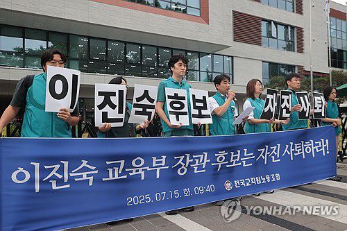 (서울=연합뉴스) 류효림 기자 = 전국교직원노동조합(전교조) 조합원들이 15일 서울 종로구 국정기획위원회 앞에서 열린 이진숙 교육부 장관 후보자 자진사퇴 촉구 기자회견에서 후보자 지명 철회 및 자진사퇴를 촉구하며 구호를 외치고 있다. 2025.7.15