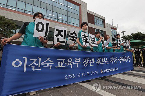 (서울=연합뉴스) 류효림 기자 = 박영환 전국교직원노동조합 위원장이 15일 서울 종로구 국정기획위원회 앞에서 열린 이진숙 교육부 장관 후보자 자진사퇴 촉구 기자회견에서 발언하고 있다. 2025.7.15