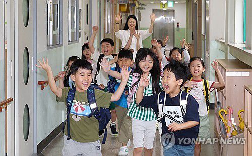 (인천=연합뉴스) 임순석 기자 = 15일 인천 부평구 부일초등학교에서 여름방학식을 마친 1학년 2반 학생들이 교실을 나서며 즐거워하고 있다. 2025.7.15