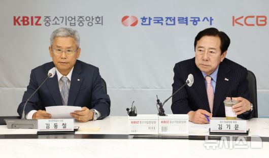 [서울=뉴시스] 조성우 기자 = 김동철(왼쪽) 한국전력공사 사장이 9일 서울 여의도 중소기업중앙회에서 열린 중소기업중앙회-한국전력공사-코리아크레딧뷰로(KCB) 소상공인 포용적 금융 지원을 위한 서비스 제휴 협약식에서 발언하고 있다. 오른쪽은 김기문 중소기업중앙회장. 2025.07.09. xconfind@newsis.com |