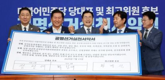 정청래·박찬대 더불어민주당 당대표 후보와 황명선 최고위원 후보가 15일 국회에서 열린 공명선거 실천 서약식에서 기념촬영을 하고 있다. 왼쪽부터 김병기 당대표 직무대행 겸 원내대표, 정청래·박찬대 당대표 후보, 황명선 최고위원 후보, 김정호 중앙당선거관리위원장. <ⓒ투자가를 위한 경제콘텐츠 플랫폼, 아시아경제(www.asiae.co.kr) 무단전재 배포금지>
