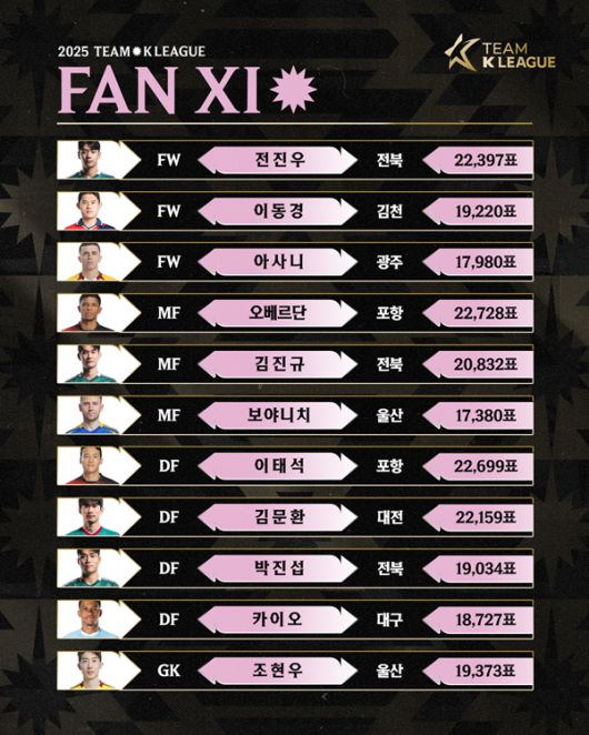 공격수(FW) 부문에서는 K리그1 득점 선두 전진우(전북, 2만2397표)와 함께 이동경(김천, 1만9220표), 아사니(광주, 1만7980표)가 선발됐다.