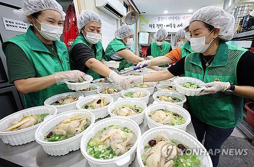 (수원=연합뉴스) 권준우 기자 = 15일 오전 경기도 수원시 권선구 평동행정복지센터에서 평동새마을부녀회 관계자들이 초복을 앞두고 관내 독거 어르신 등 취약계층에 전달할 삼계탕을 만들고 있다. 2025.7.15
