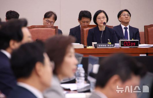 [서울=뉴시스] 김금보 기자 = 한성숙 중소벤처기업부 장관 후보자가 15일 서울 여의도 국회 산업통상자원중소벤처기업위원회에서 열린 인사청문회에서 증인 불출석, 자료 미제출 등과 관련한 의사진행 발언을 듣고 있다. 2025.07.15. kgb@newsis.com