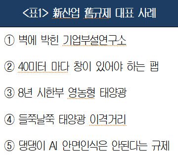 첫 손에 꼽은 게 벽에 막힌 기업 연구실이다. 첨단 전략산업은 기술 변화에 따라 인력의 재배치가 빈번하고 연구실, 사무실 등 아이디어 융합을 위해 업무의 벽을 허물어 가고 있다. 그러나 현행 기초연구법상 ‘고정벽체와 별도 출입문을 갖춘 공간’만 기업부설연구소로 인정하고 있다. 그러다 보니 기업부설연구소 연구인력에 대한 세액공제를 받으려면 반드시 4면의 콘크리트 벽과 출입문을 만들어야 한다. 대한상의 관계자는 “별도의 의미 없는 공간을 세워야 하는 것은 혁신을 추구해야 하는 현실과 맞지 않다”고 주장했다.
