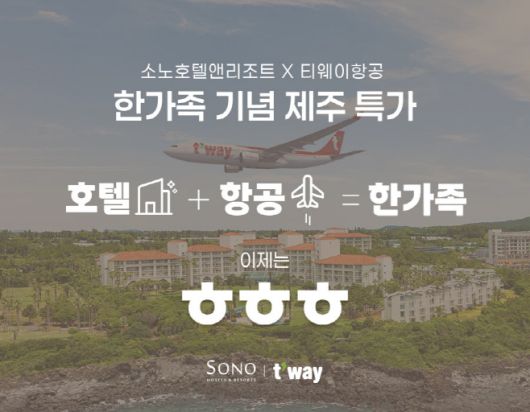 아시아투데이 이장원 기자 = 대명소노그룹 소노인터내셔널이 티웨이항공과 한가족으로 동행하게 된 것을 기념해 항공과 숙박을 연계한 '이제는 ㅎㅎㅎ(항공+호텔=한가족)' 프로모션을 진행한다고 15일 밝혔다.